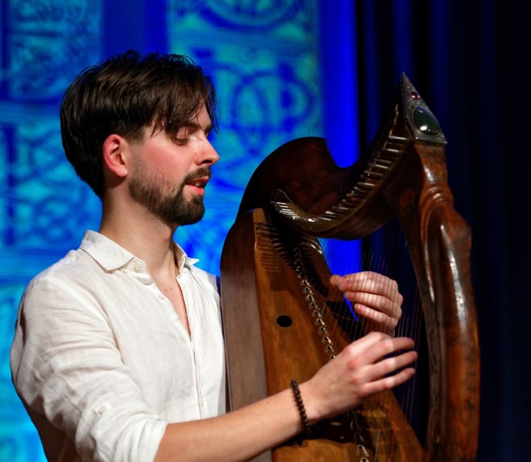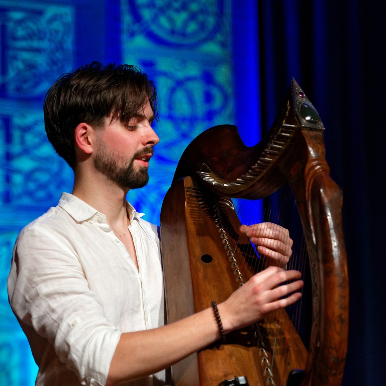 La beauté de sa harpe nous ramène aux temps anciens. Mikaël se joue des cordes en bronze aux sonorités riches et cristallines.