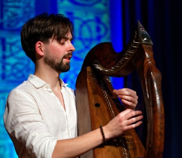 La beauté de sa harpe nous ramène aux temps anciens. Mikaël se joue des cordes en bronze aux sonorités riches et cristallines.